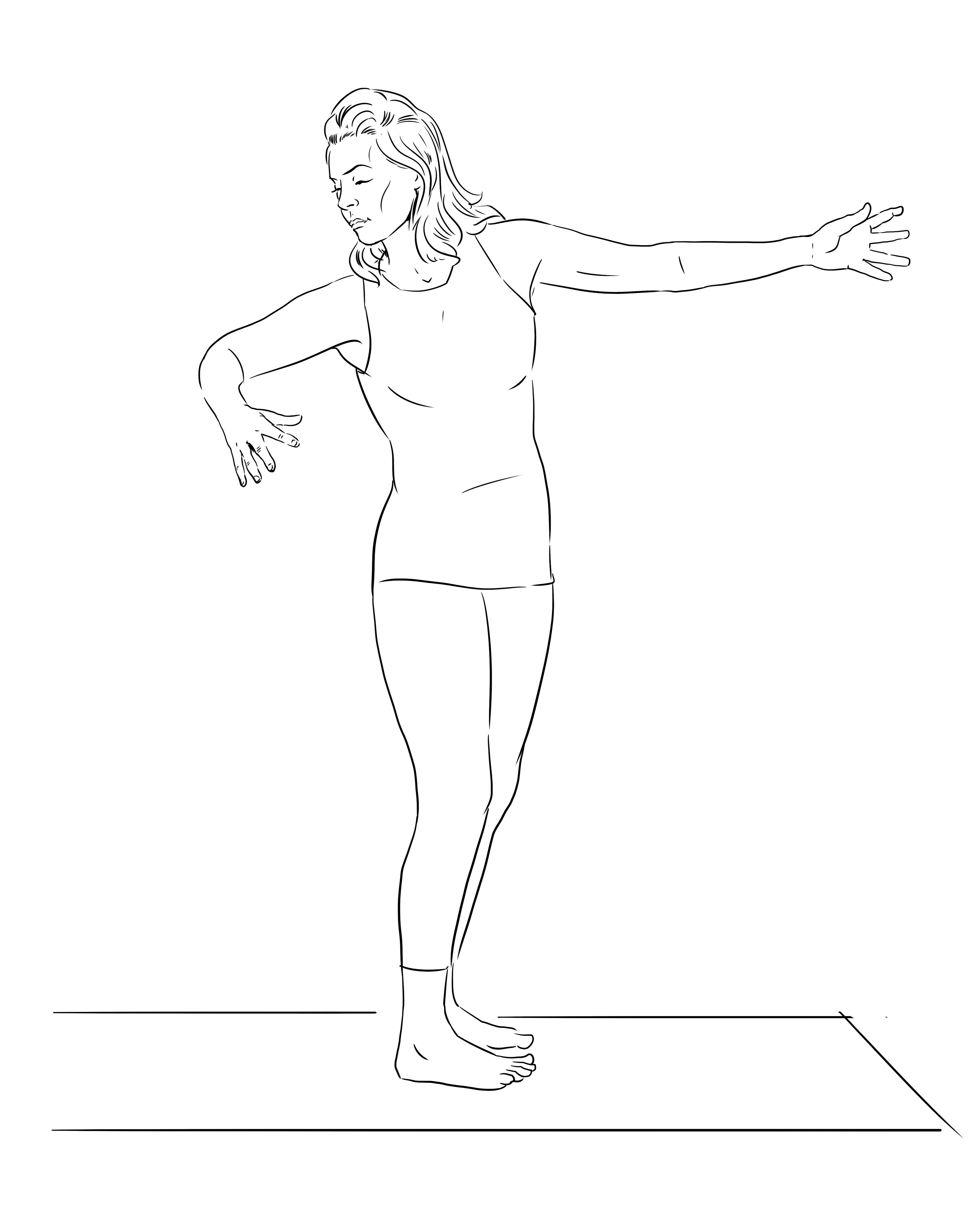 - Reach forward with one arm, back with the opposite elbow and alternate sides in a rotating motion that loosens tissues around the diaphragm, ribs and belly. This supports breathing, digestive and reproductive health by loosening the fascia (connective tissue) in that area.