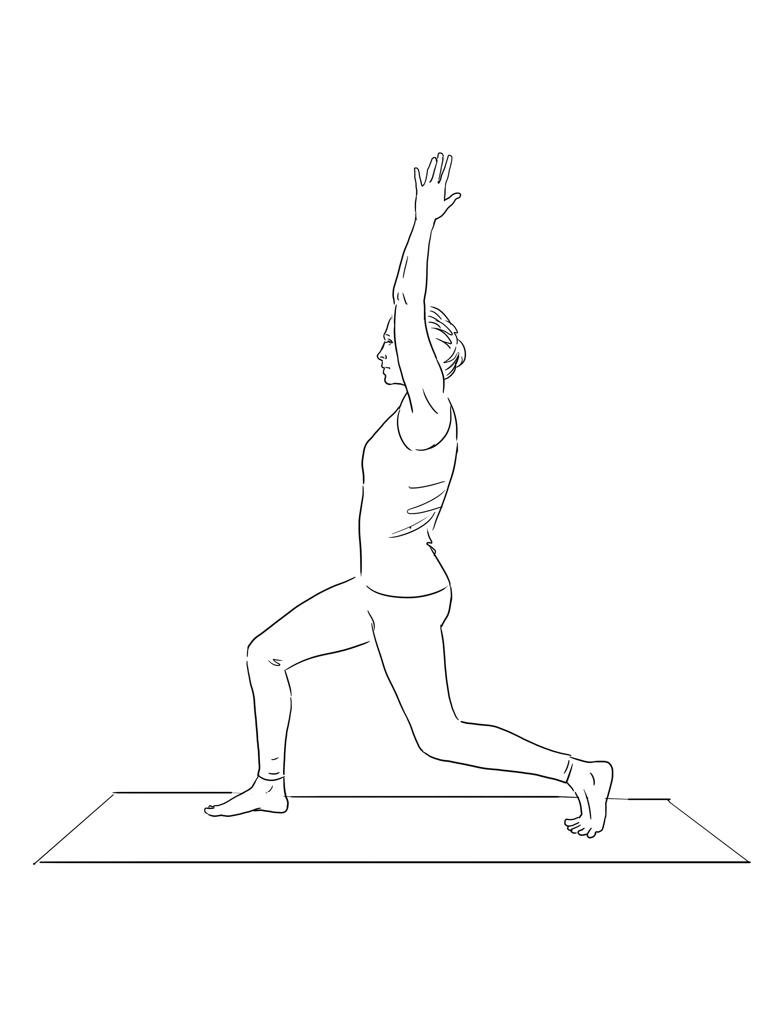 - With feet hip-width apart and parallel, step into a lunge with the back knee bent. The opposite arm to the front leg is raised, the other hanging down. Bounce here a little to get the feel for movement, drawing up through the belly to support the lower back.