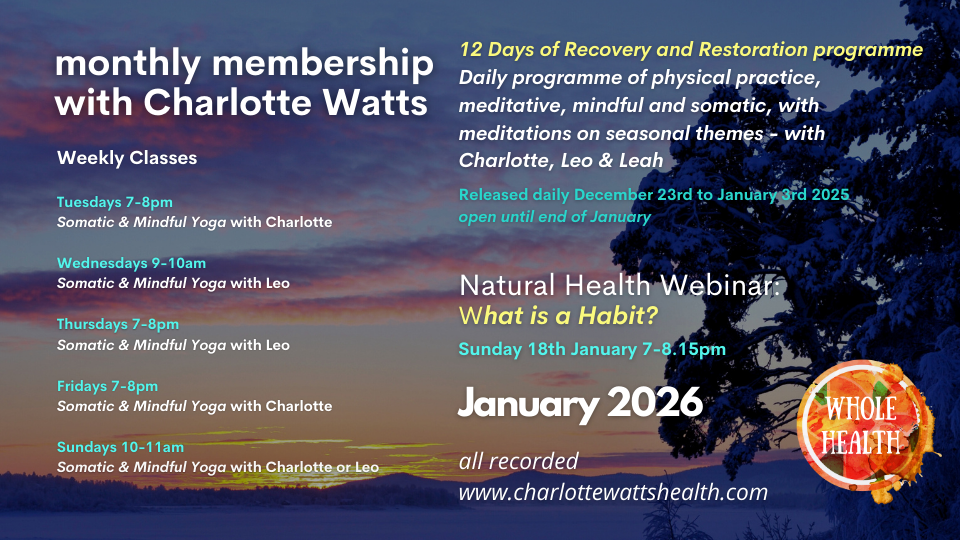 Charlotte is joined within the Whole Health offerings by similarly experienced teachers Leonie Taylor and Leah Barnett; both of whom she has worked with for many years and who bring their own voices and specialisms along. This creates a timetable over each week that offers a complementary rhythm of differing ways of tuning into and caring for our whole being; body and mind.